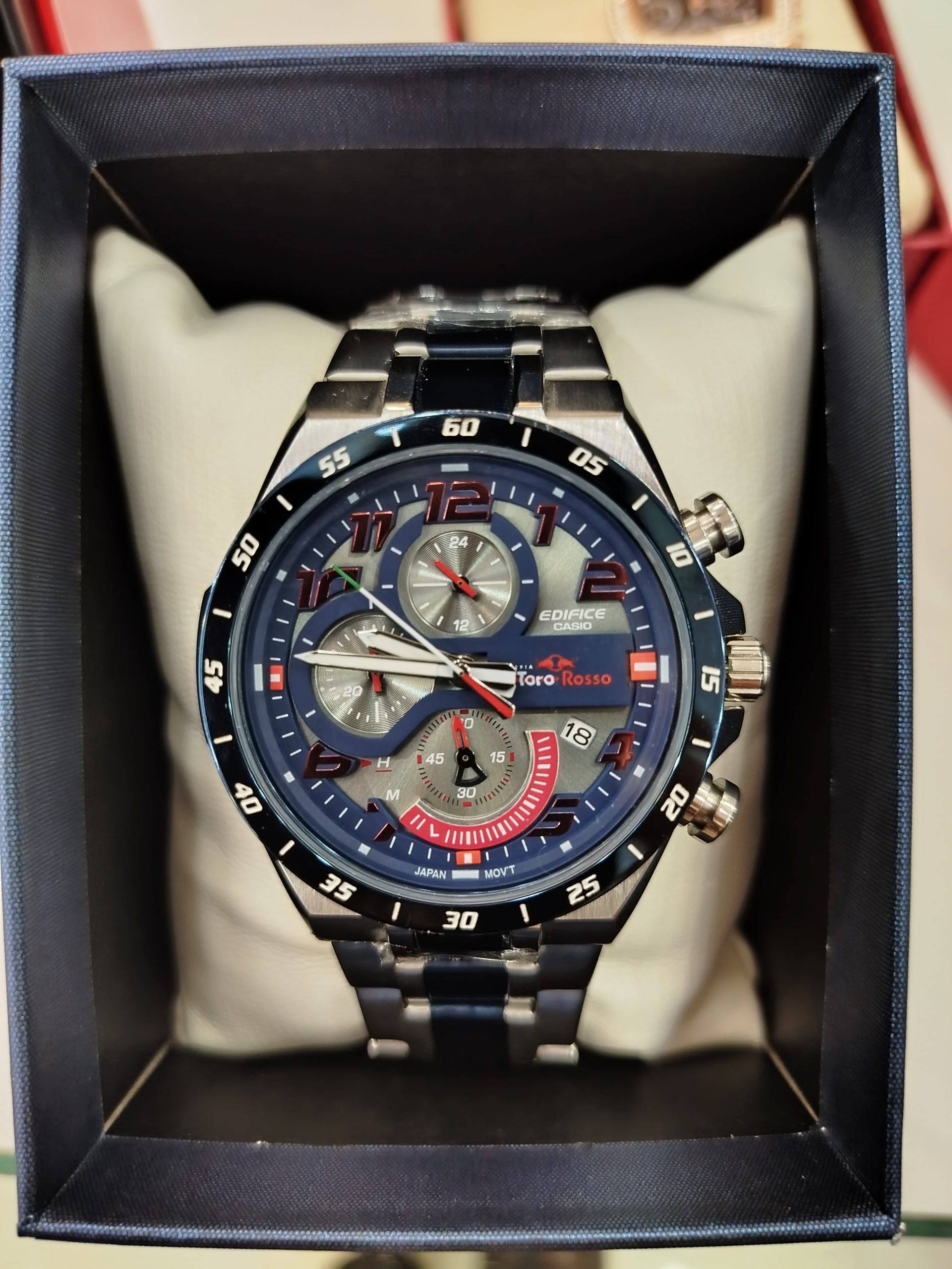 Slip into the driver’s seat with the intensity of a race car driver. Introducing the cool-blue EDIFICE high-performance motorsports chronograph. The ECB-2200 WINDFLOW takes on a carbon fiber-reinforced resin case made with indigo blue carbon — a first for the EDIFICE line. The blue ion-plated bezel and band, together with the blue base tones of the dial, exude a cool stylishness that captures the icy concentration needed to dominate on the racetrack. It’s a snap to sync with your smartphone via Bluetooth®. Tap into the app to access functions that make life easier whether or not you’re behind the wheel — get automatically adjusted precision timekeeping, effortlessly manage the world time list of over 300 cities around the world, transfer stopwatch data measured to the millisecond to your smartphone, find your phone just by holding down a button on your watch, and more! Tough Solar charges the watch from sunlight or even fluorescent lamp light.